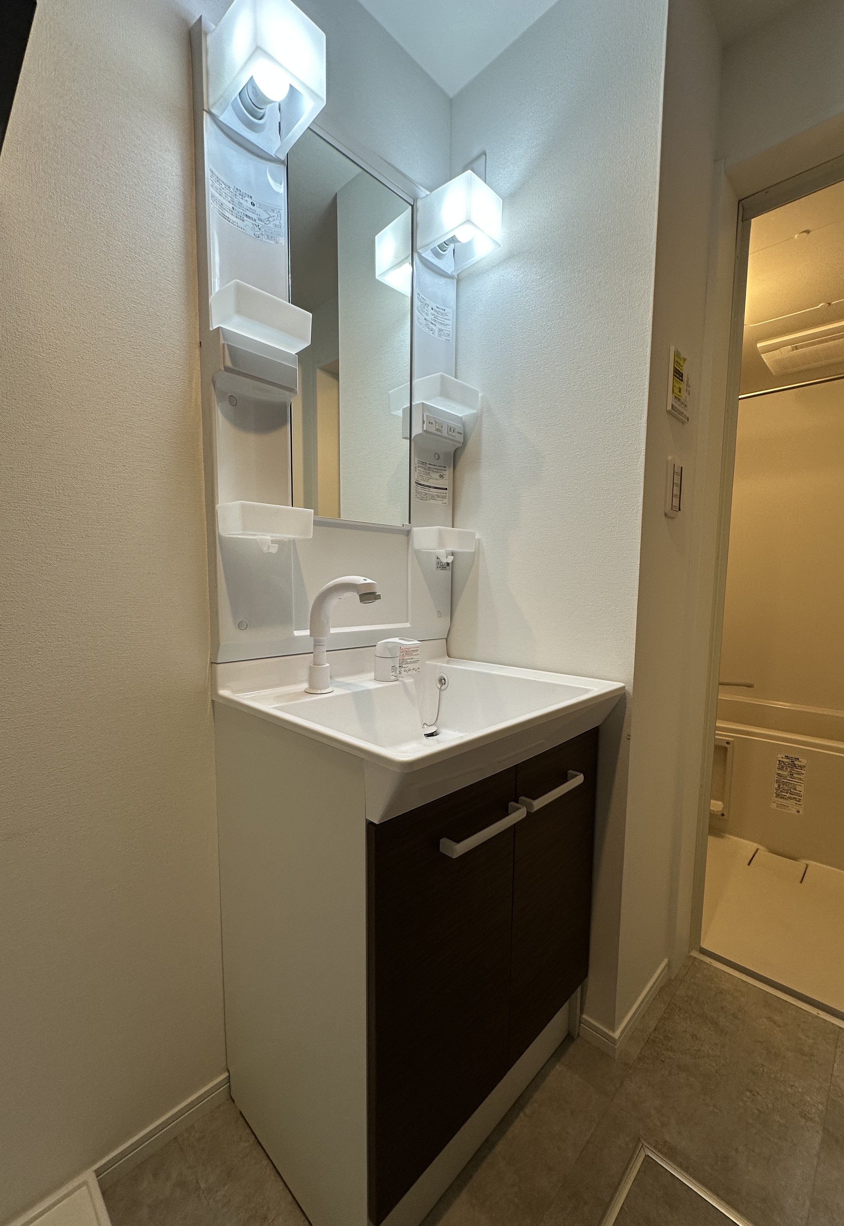 視界に物が出にくい環境をつくることで、空間全体の印象をすっきりと保ちやすくしています。また、独立洗面台にはシャワー機能付き水栓を採用。