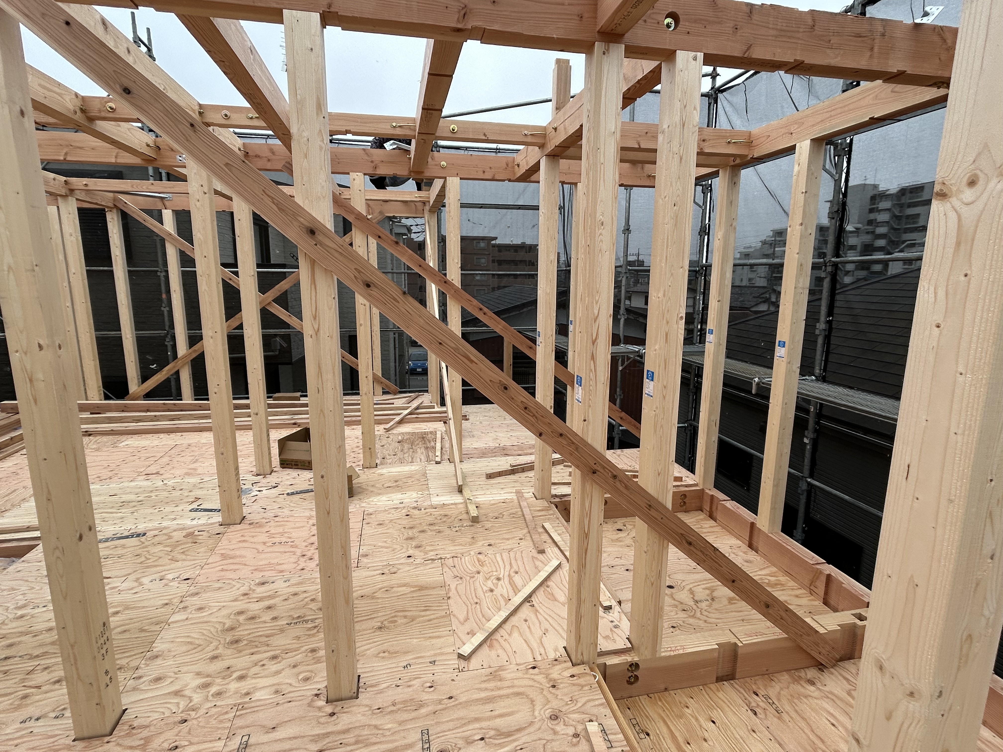 これまで基礎だけだった場所に、みるみるうちに建物の形が見えてくるので、家づくりの中でも特にワクワクする瞬間です😲‼️そして現在は、骨組みが完成し、内部ではボード張りなど内装工事も少しずつスタートしています。
