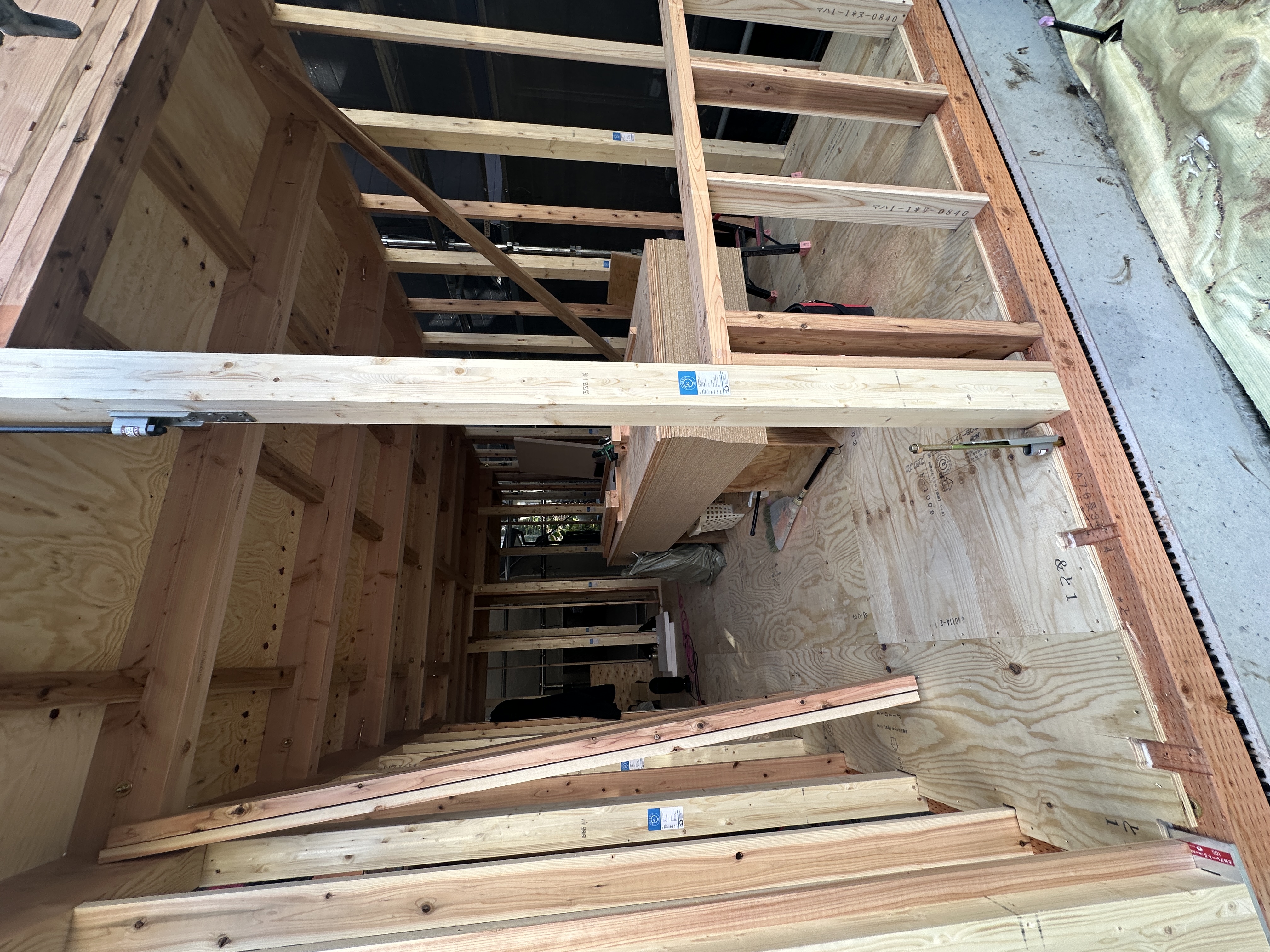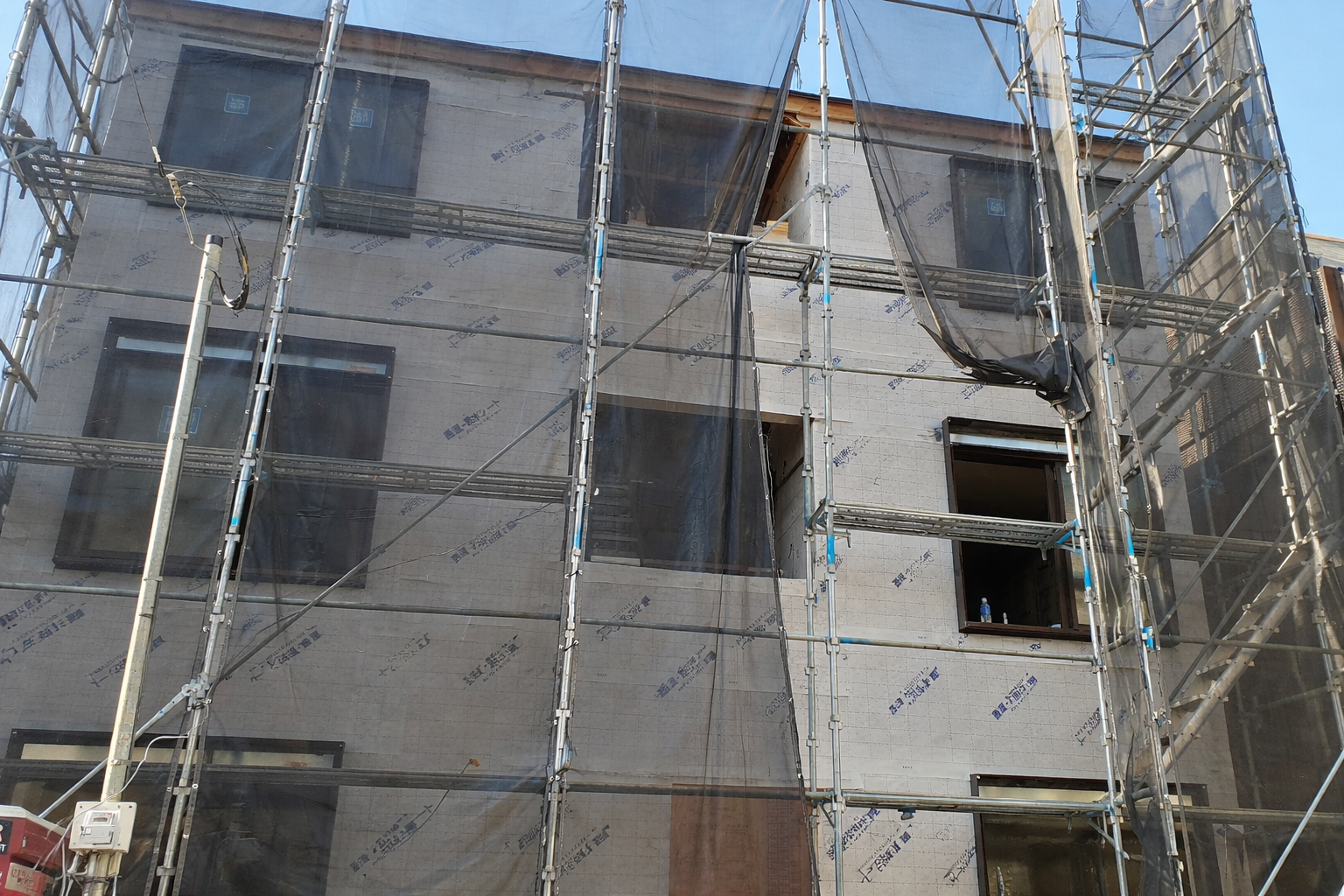 建物の骨組みが完成すると、いよいよ建物の全体像が少しずつ見えてきます。現場では、外壁工事やサッシの取り付けなどの外観工事と並行して、室内のボード施工など内装工事も進行中です。
